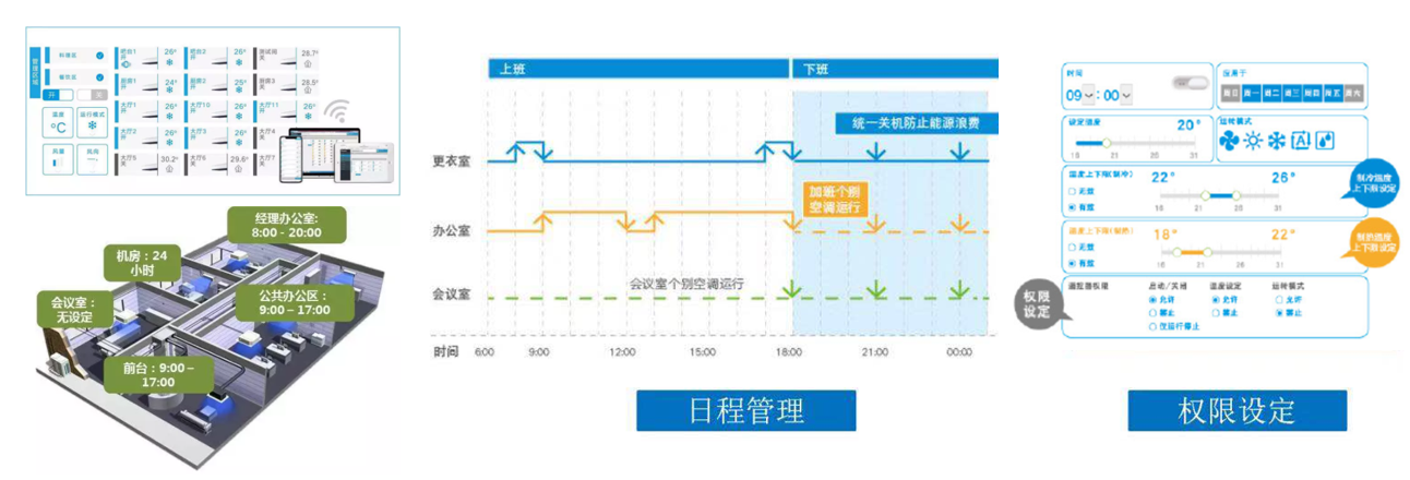根據日常使用情況可對空調進行日程設定,避免每日手動開關的繁瑣工作,更能有效減免空調忘關造成的能源浪費。而權限設定既可保持靈活的溫度調節(jié)性,又能防止無關人員隨意調控空調的情況。